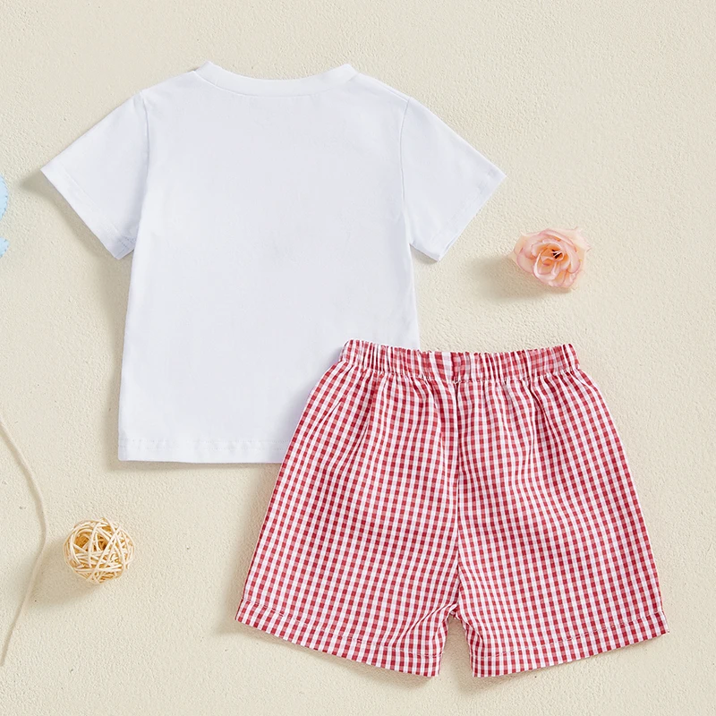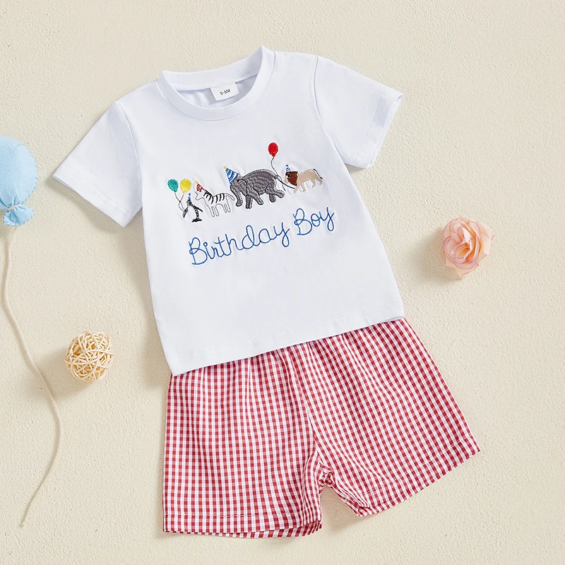 Toddler Boy Birthday Clothes Letter Animal Print Short Sleeves Round Neck Tops with Plaid Shorts 2 Pcs Outfit