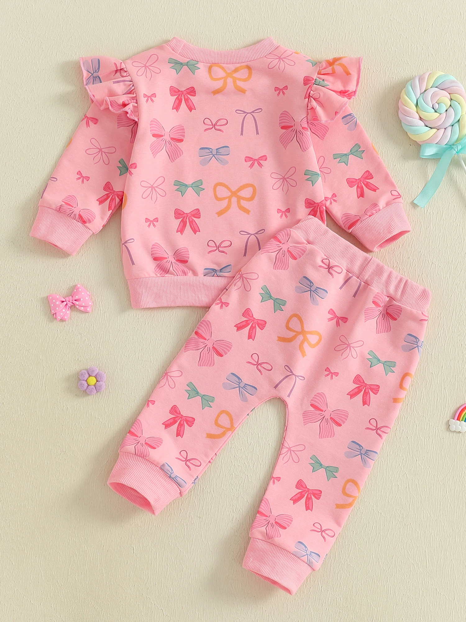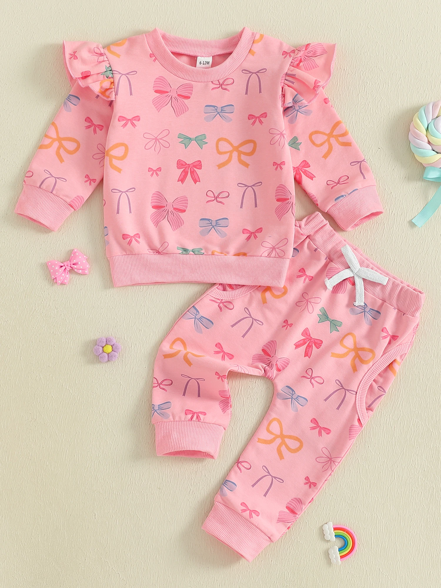 Toddler Girls Fall Outfits Bow Print Ruffled Long Sleeve Sweatshirt and Elastic Pants Set Baby 2 Piece Clothes