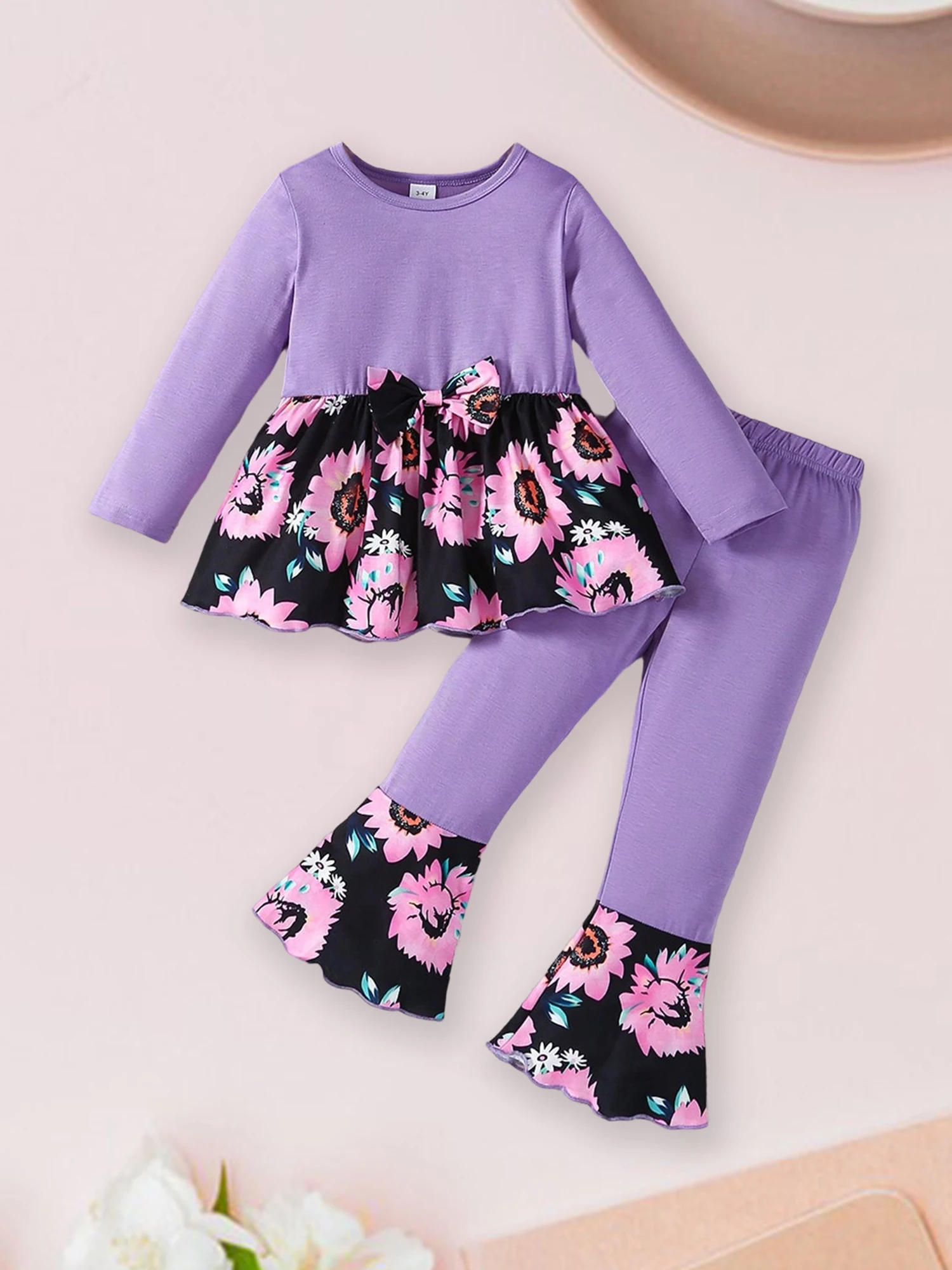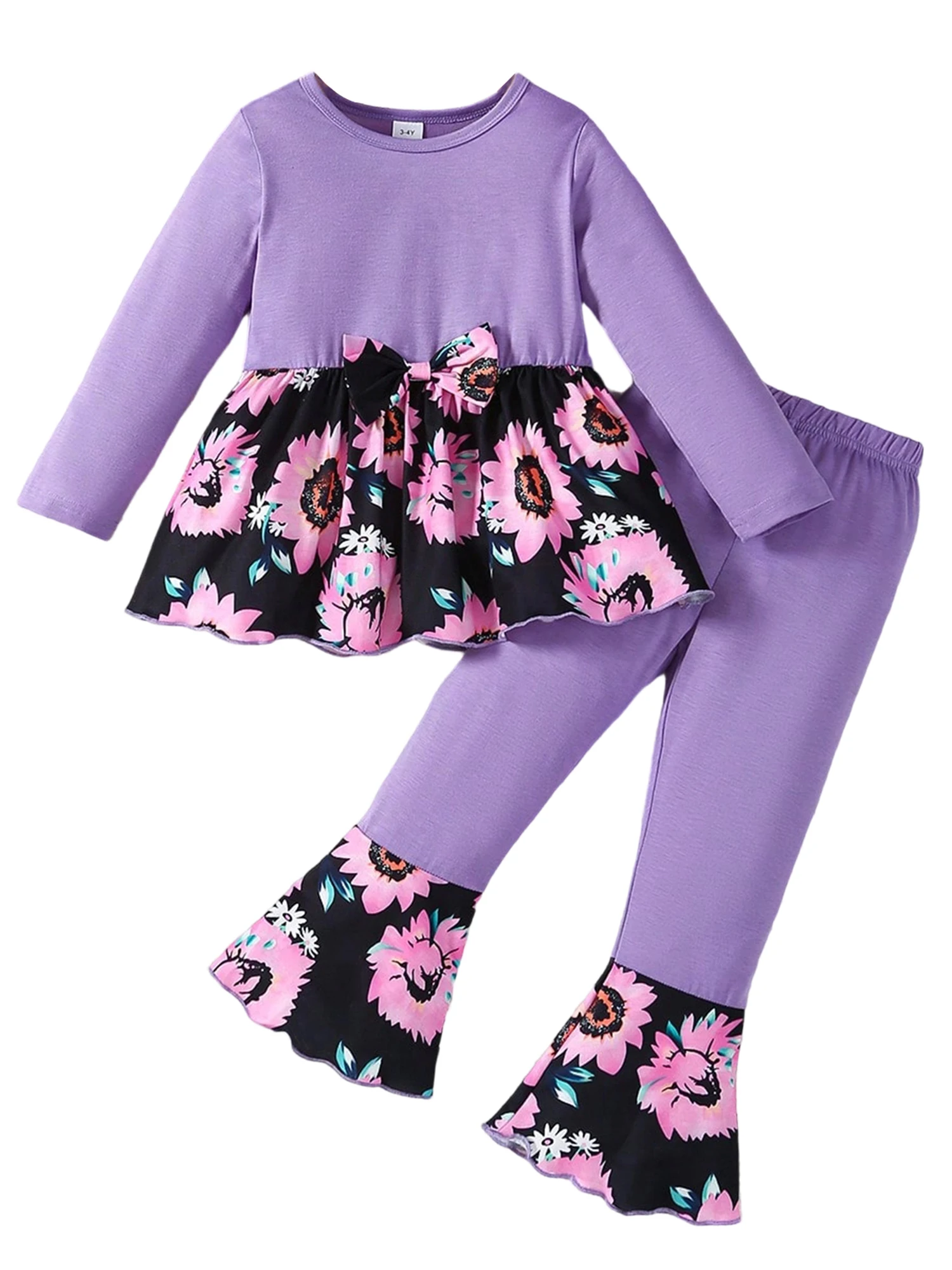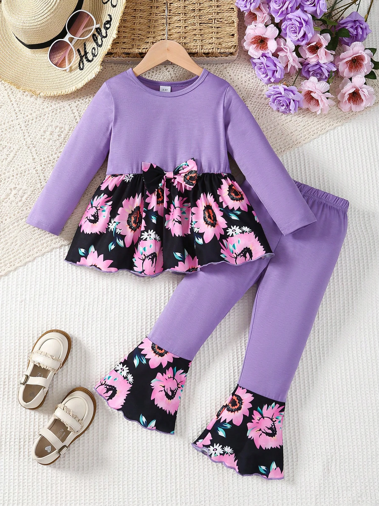 Kids Girl Fall Outfits Floral Print Round Neck Long Sleeve Tops and Flare Pants 2Pcs Clothes Set