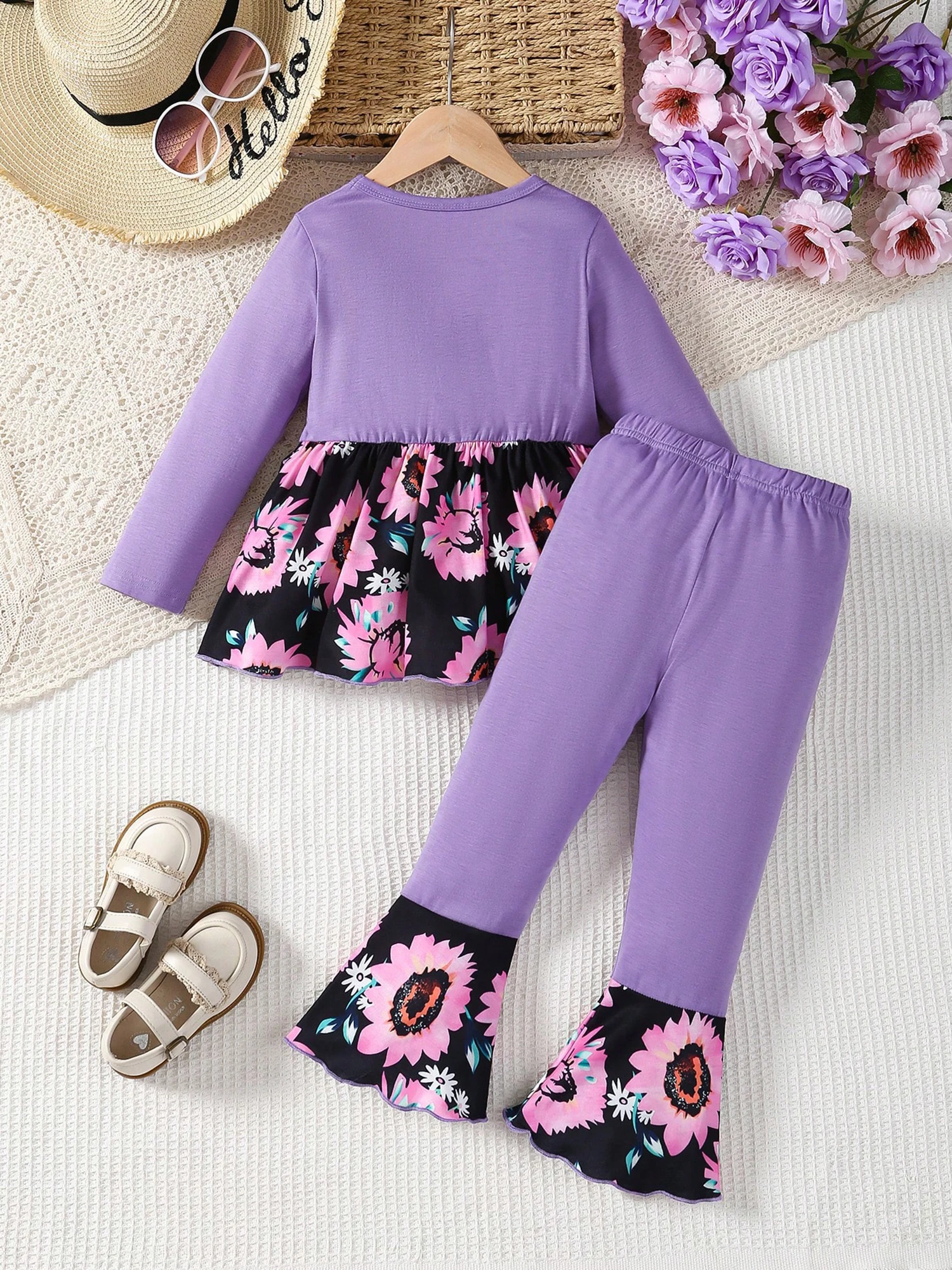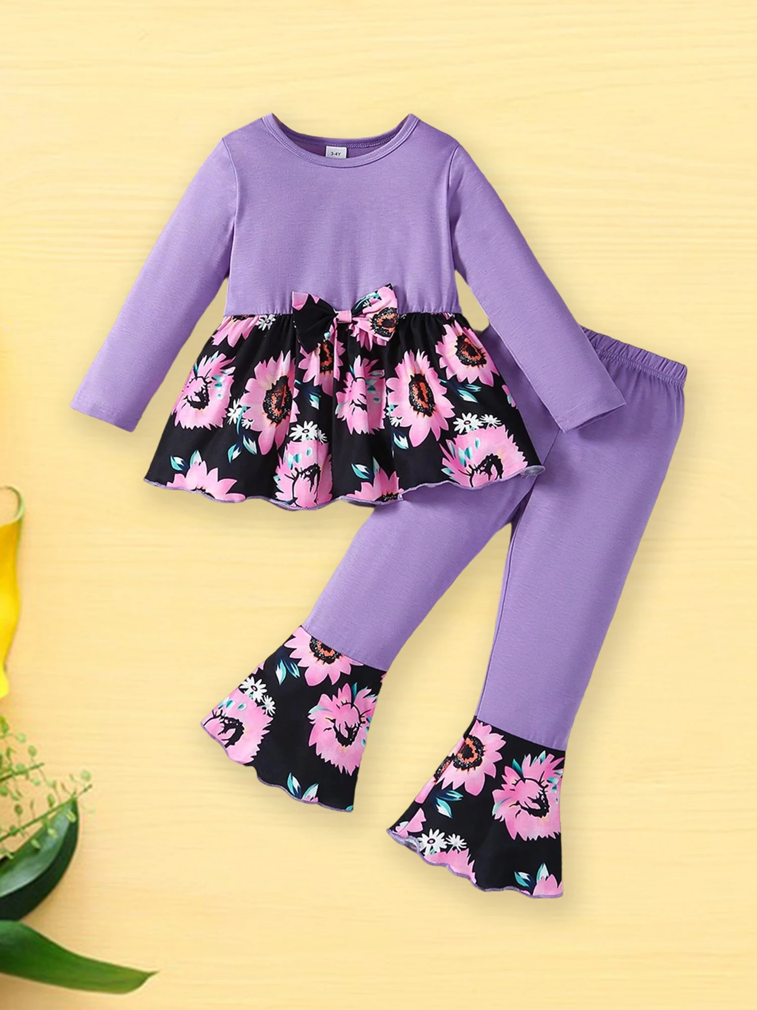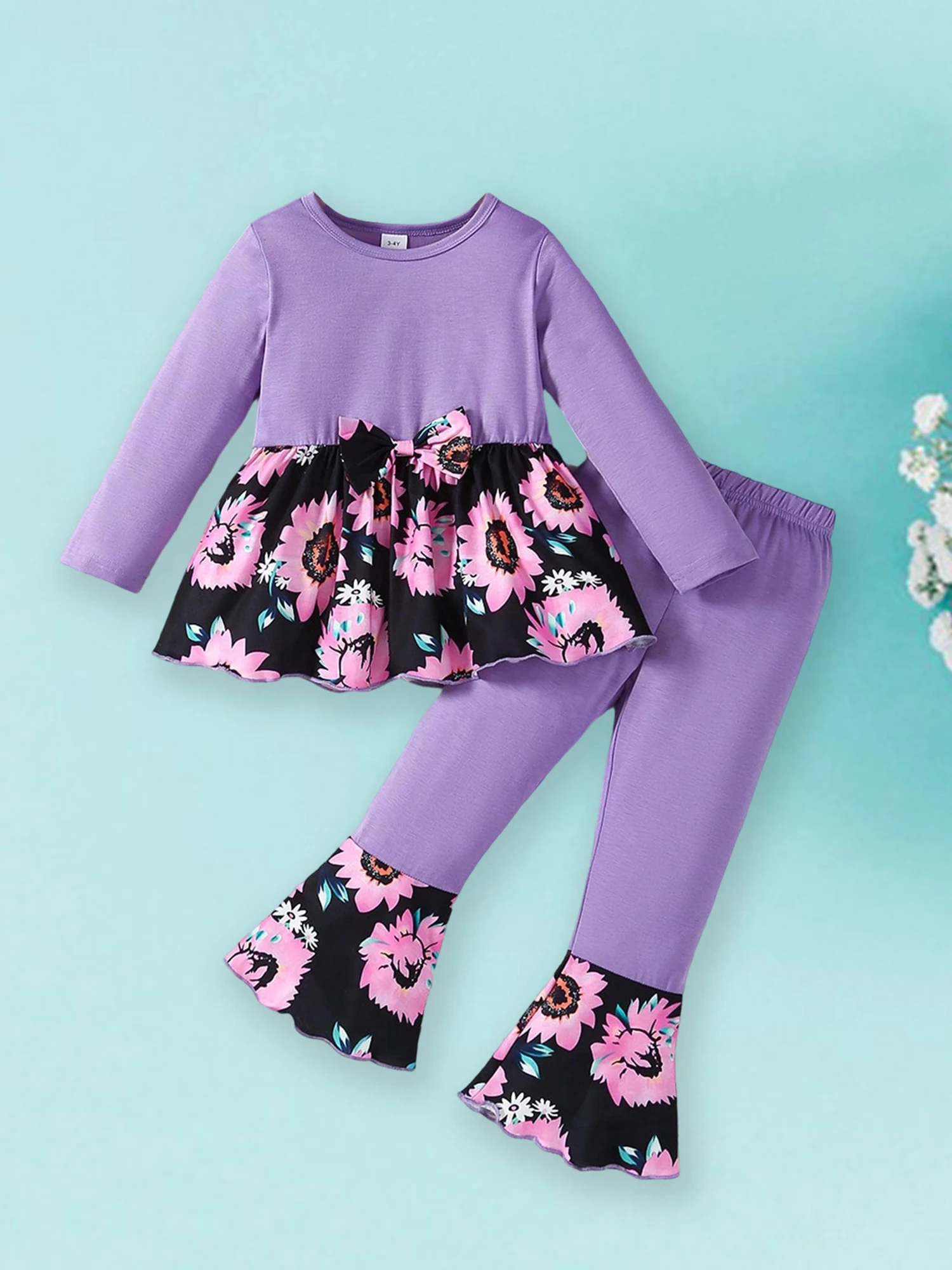 Kids Girl Fall Outfits Floral Print Round Neck Long Sleeve Tops and Flare Pants 2Pcs Clothes Set