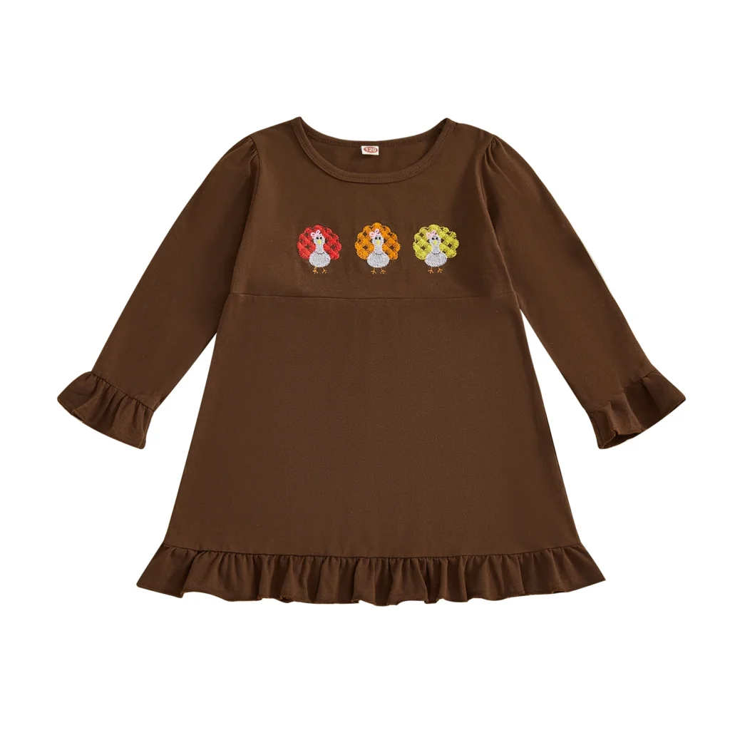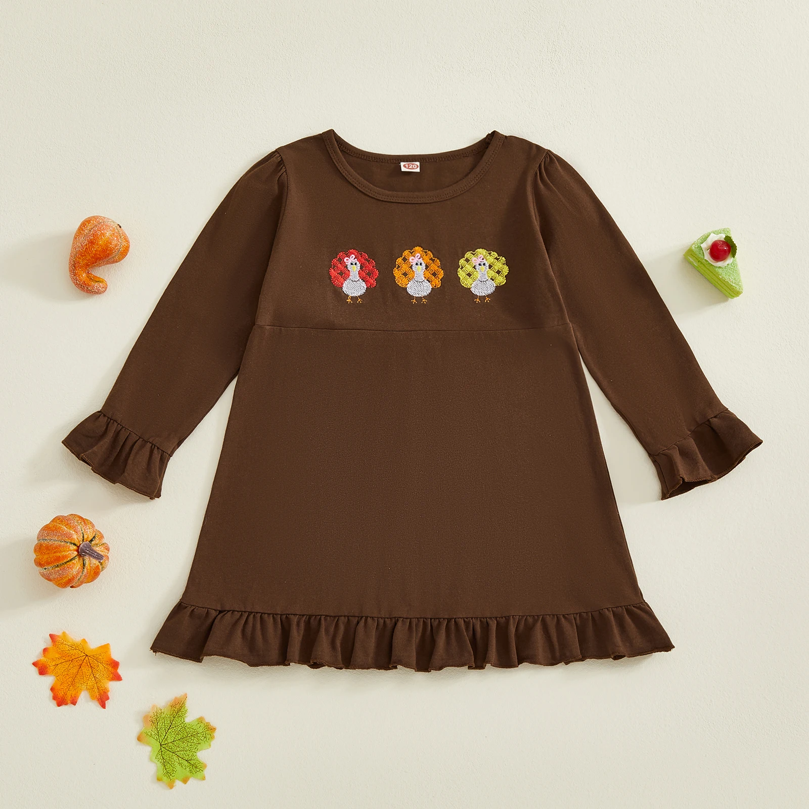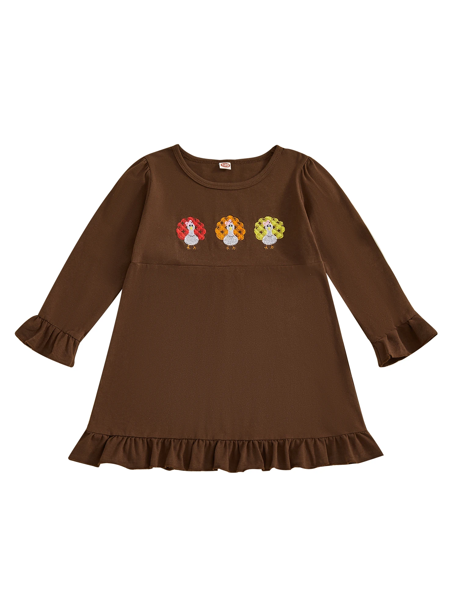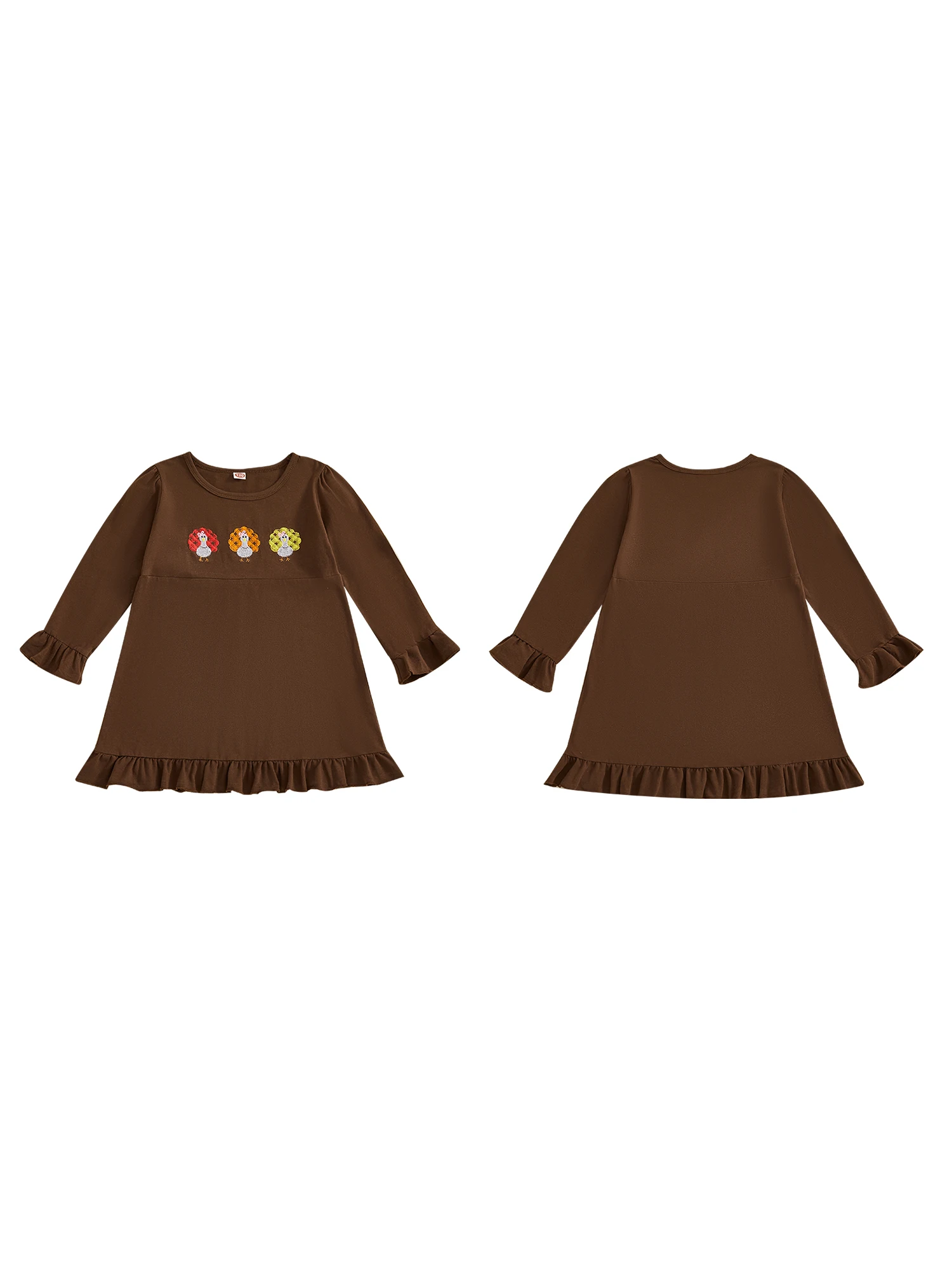 Kids Girls Dress, Long Sleeve Crew Neck Embroidery Turkey Fall Dress Thanksgiving Clothes