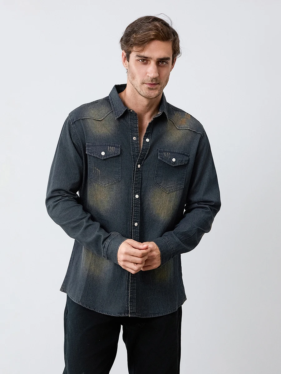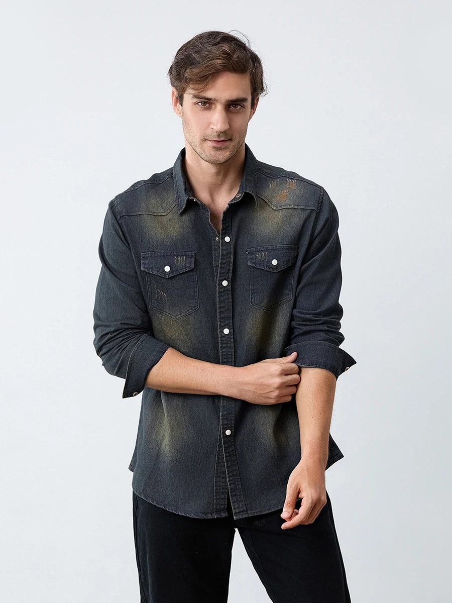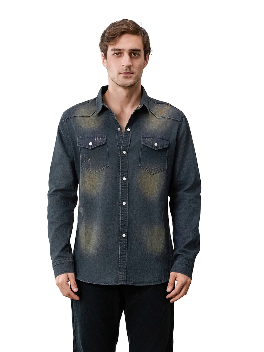 Men’s Spring Autumn Casual Shirts Solid Color Long Sleeve Lapel Denim Tops Button Shirts for Party