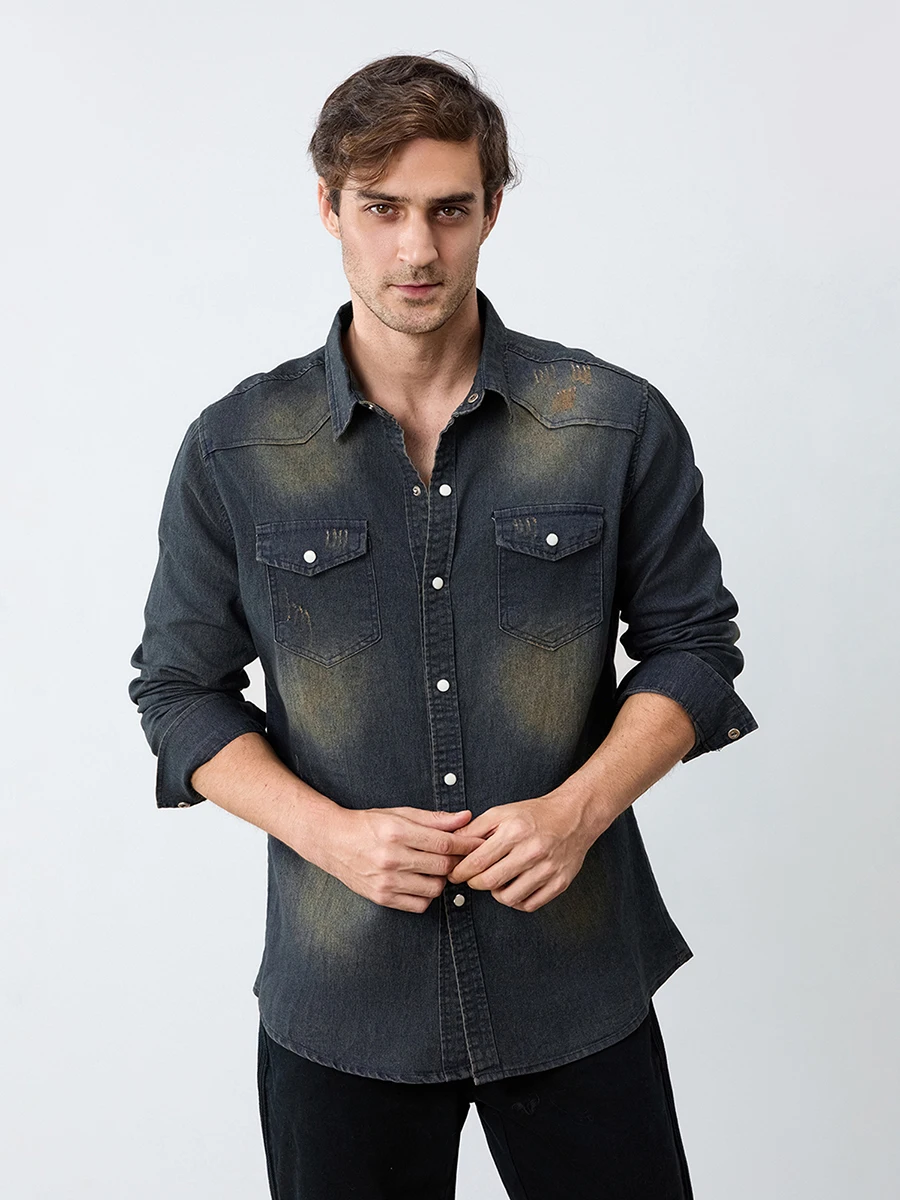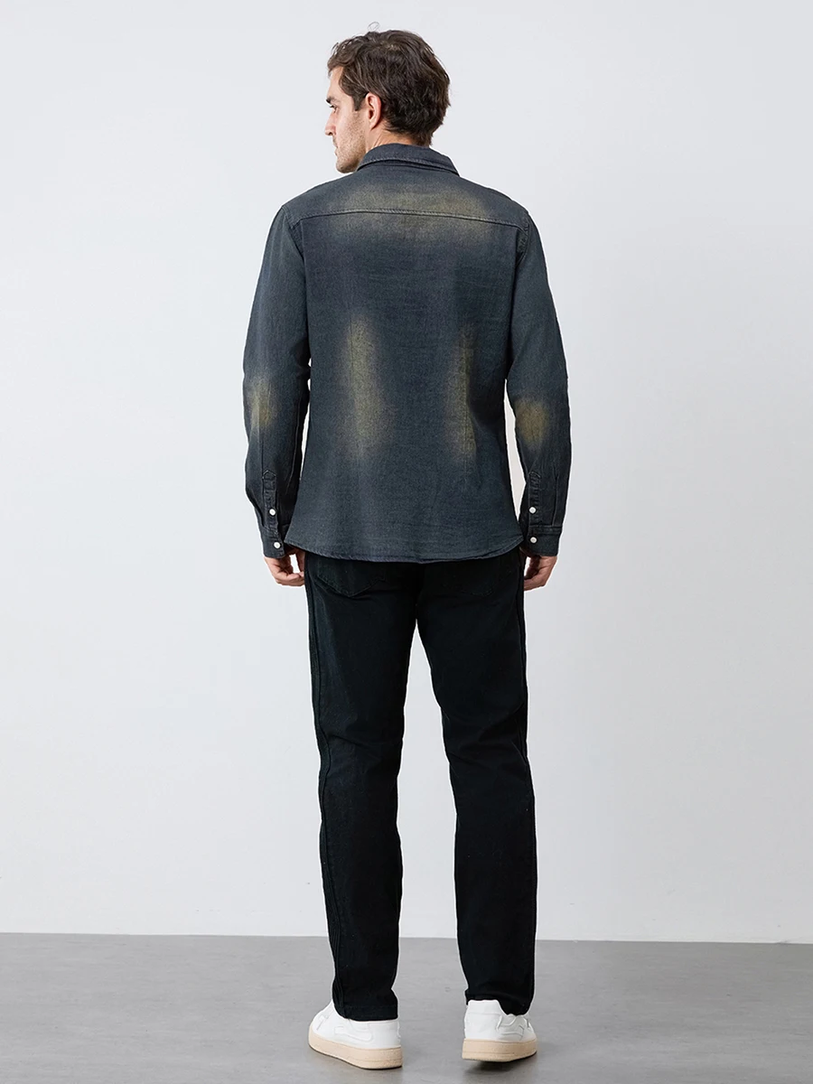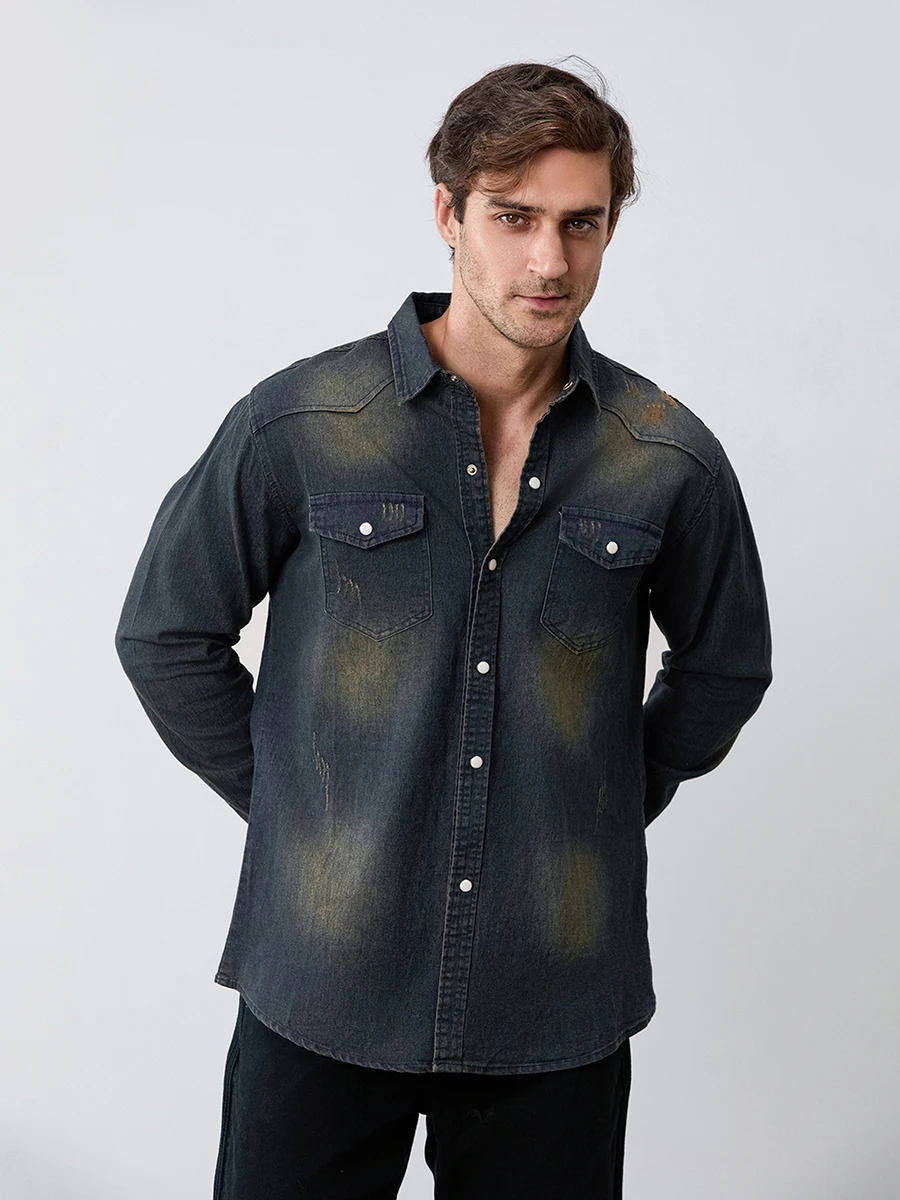 Men’s Spring Autumn Casual Shirts Solid Color Long Sleeve Lapel Denim Tops Button Shirts for Party
