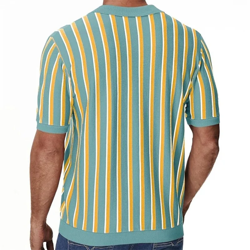 Men Striped Knit Shirt Regular Fit Lapel V Neck Short Sleeve Tops Trendy Summer Streetwear