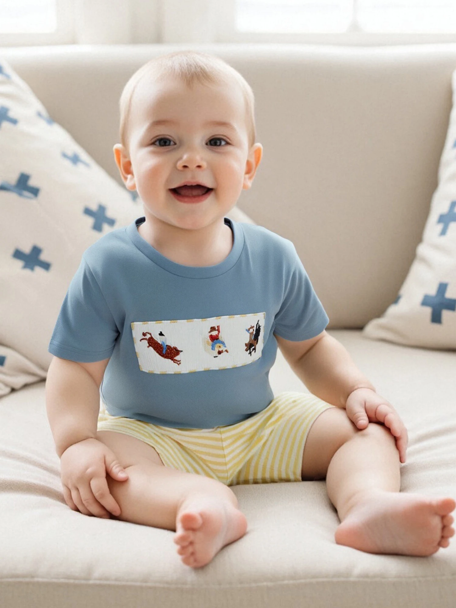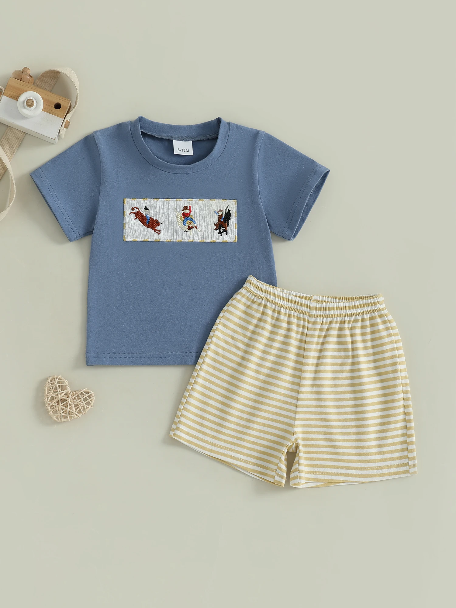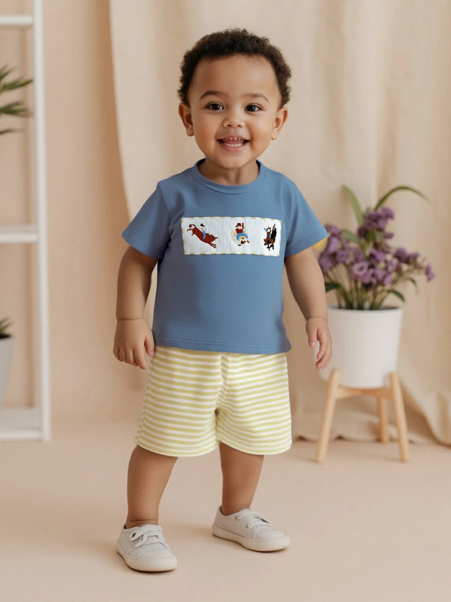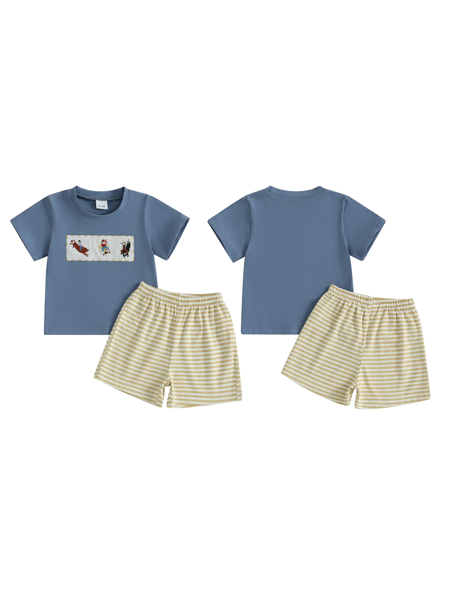Baby Boys Western Outfits Embroidery Short Sleeves T-Shirt and Elastic Striped Shorts Set for 2 Piece Clothes Set