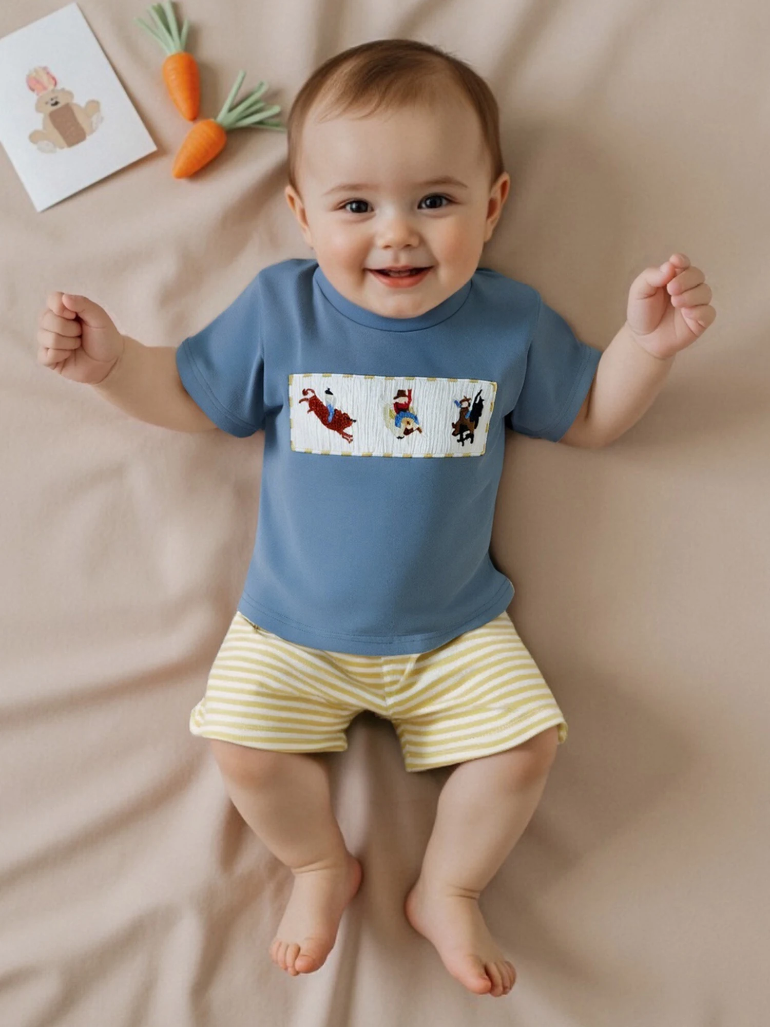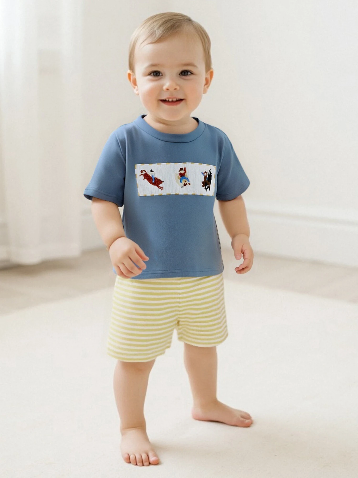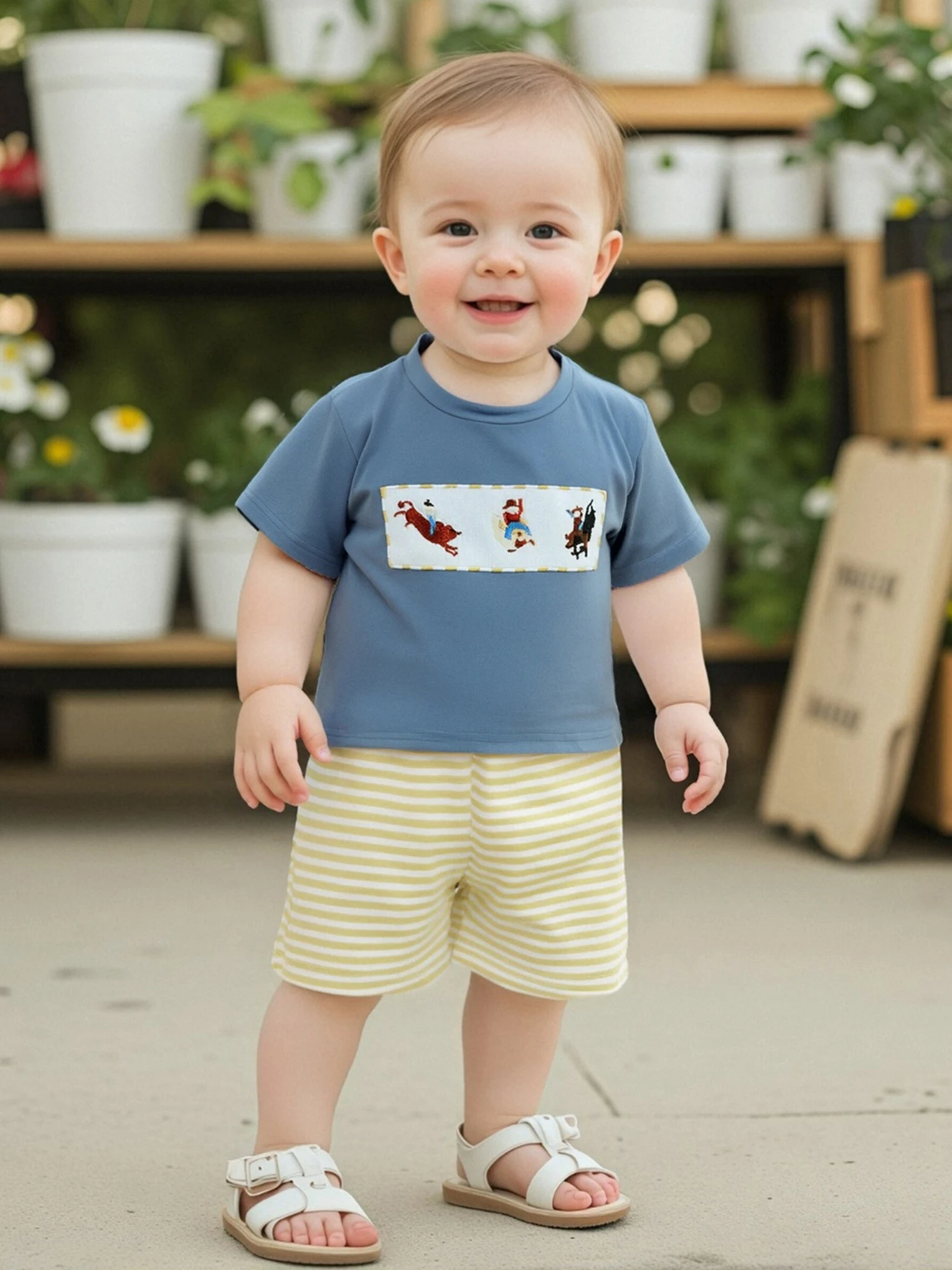 Cute baby boy clothes; Baby boy t-shirt with western embroidery, round neckline and short sleeves; Baby boy shorts with striped print and elastic waist design to ensure comfort and fit