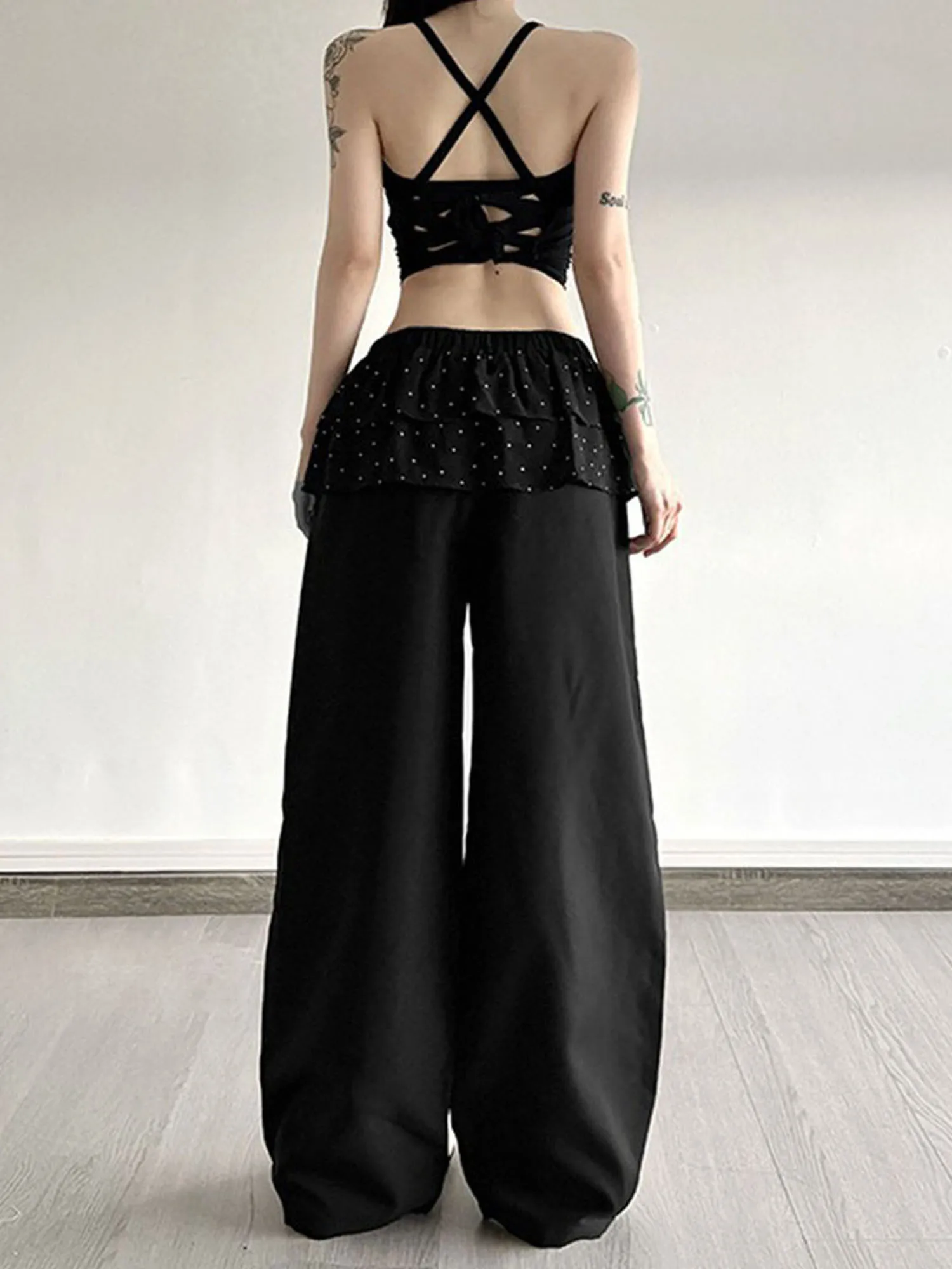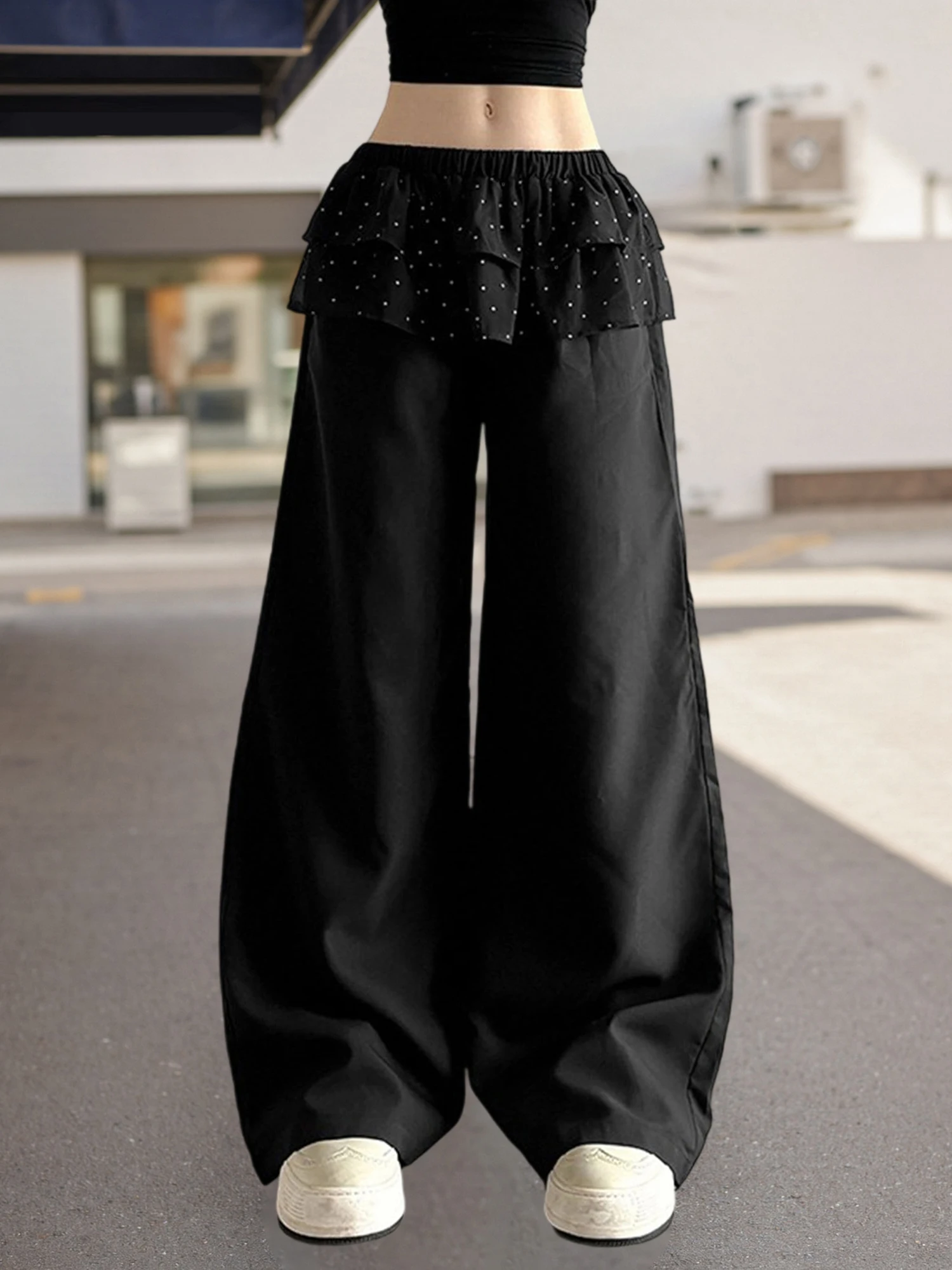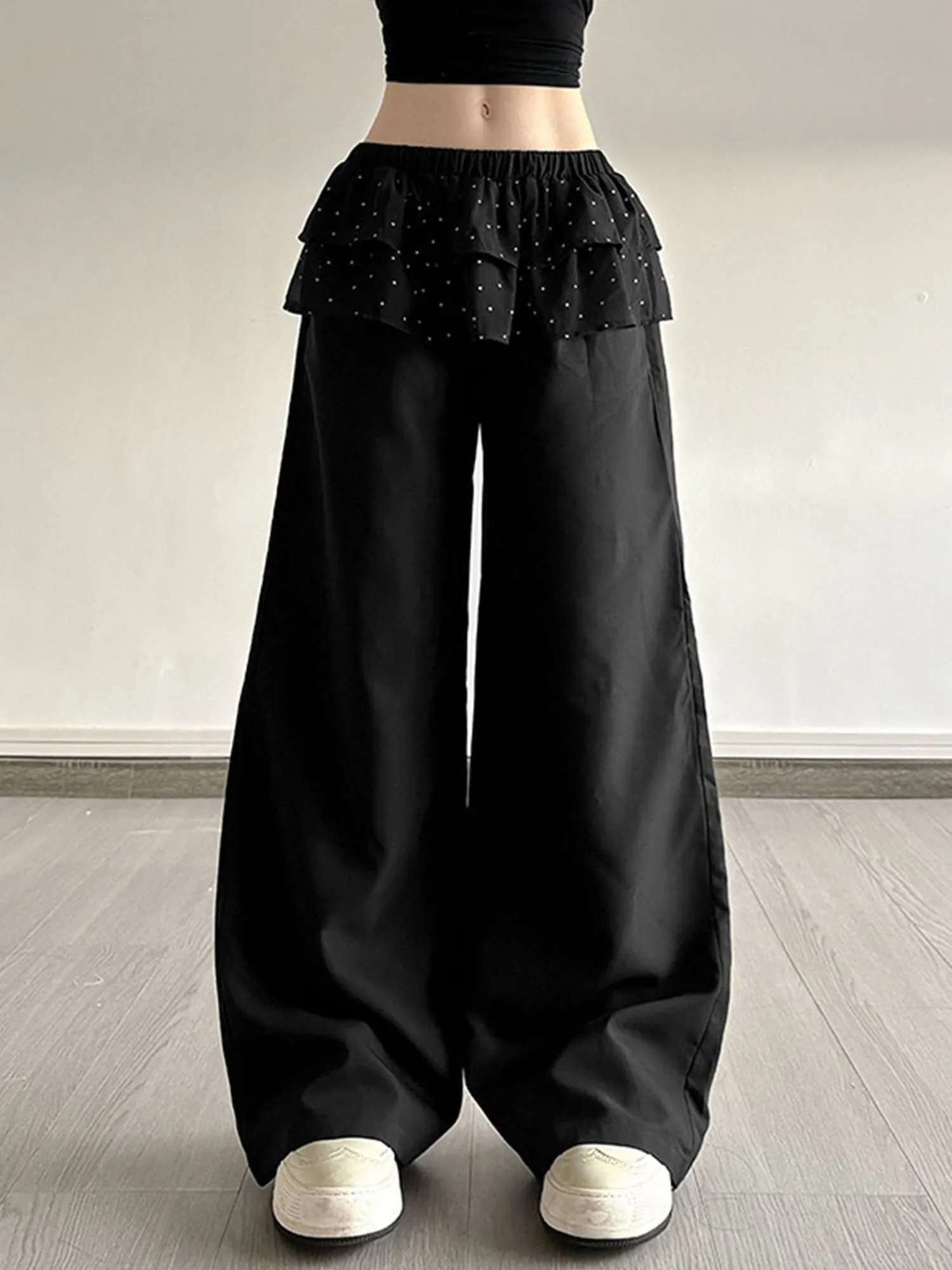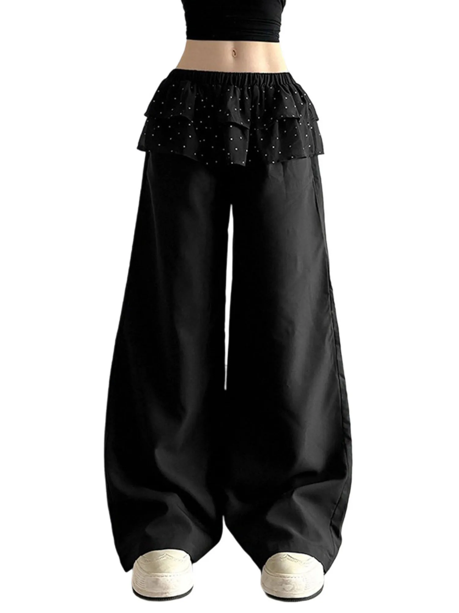 Women’s Spring Summer Baggy Pants Elastic Waistband Low Waist Loose Wide Leg Pants with Fart Curtain