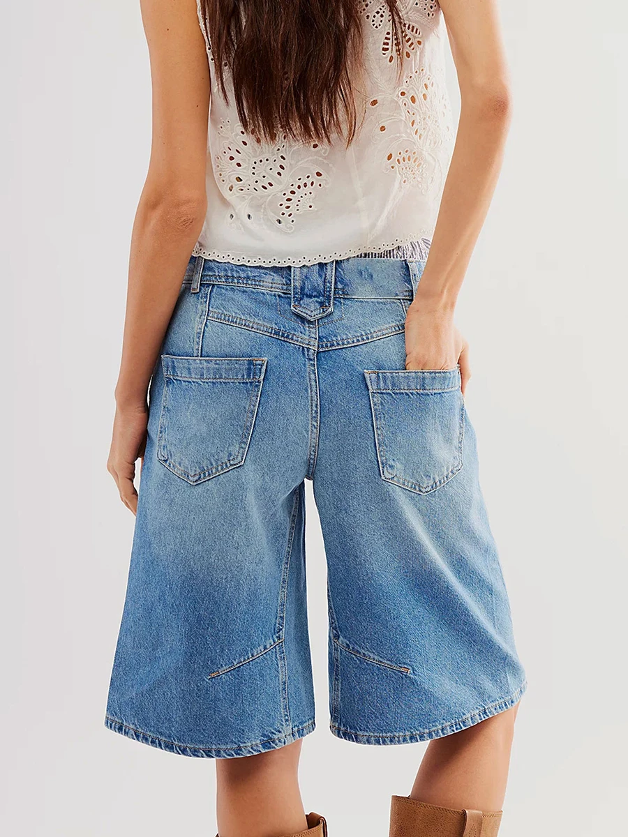 Womens Knee Length Denim Shorts Solid Color Low Waist Wide Leg Jean Shorts for Summer