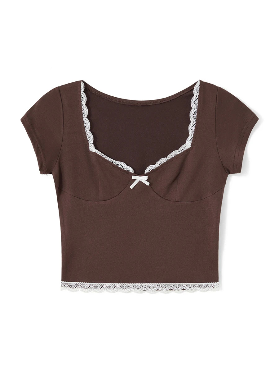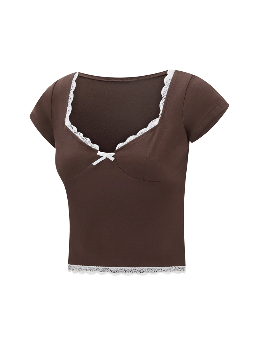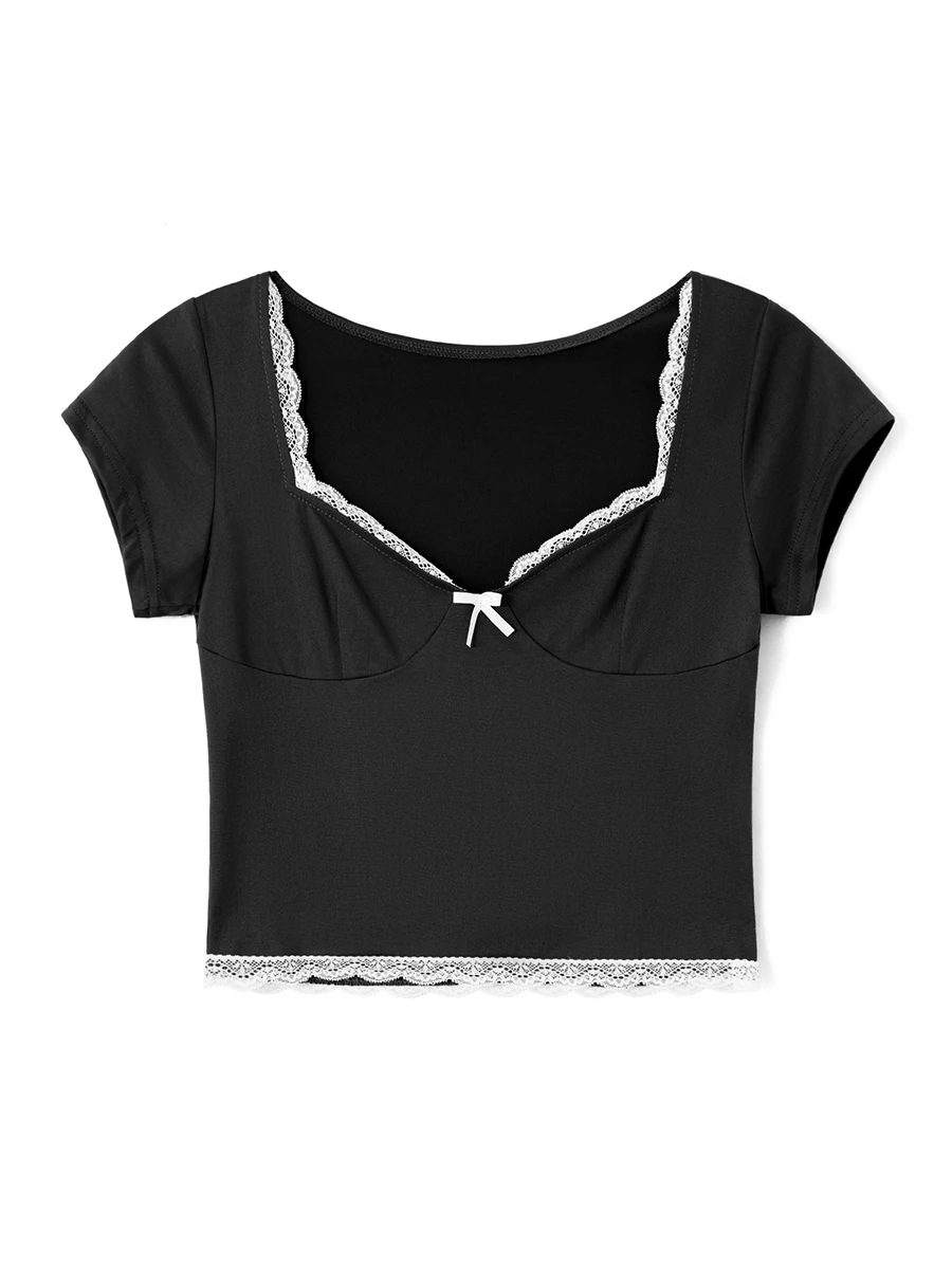 Women’s Lace Trim Cropped Tops Short Sleeve Sweetheart Neck Mini Bow Front Sweet T-Shirt