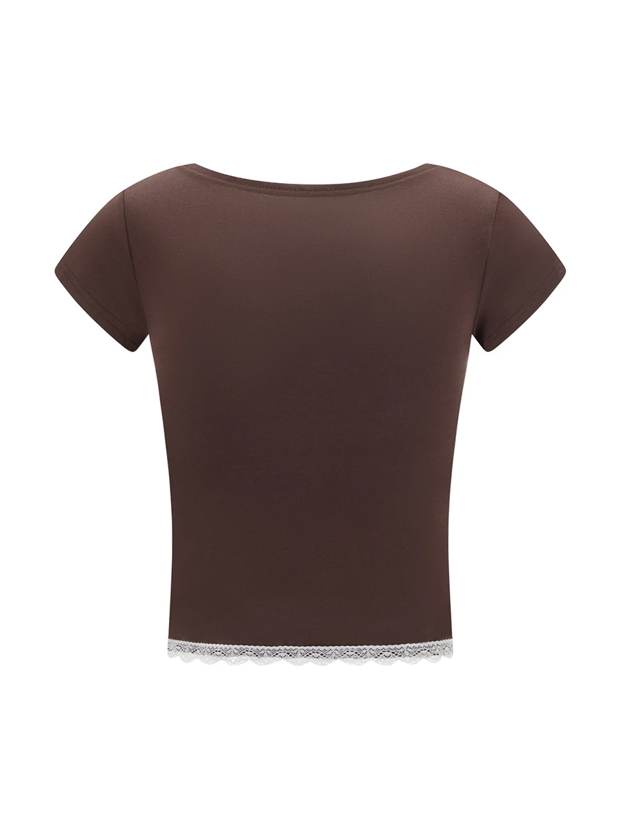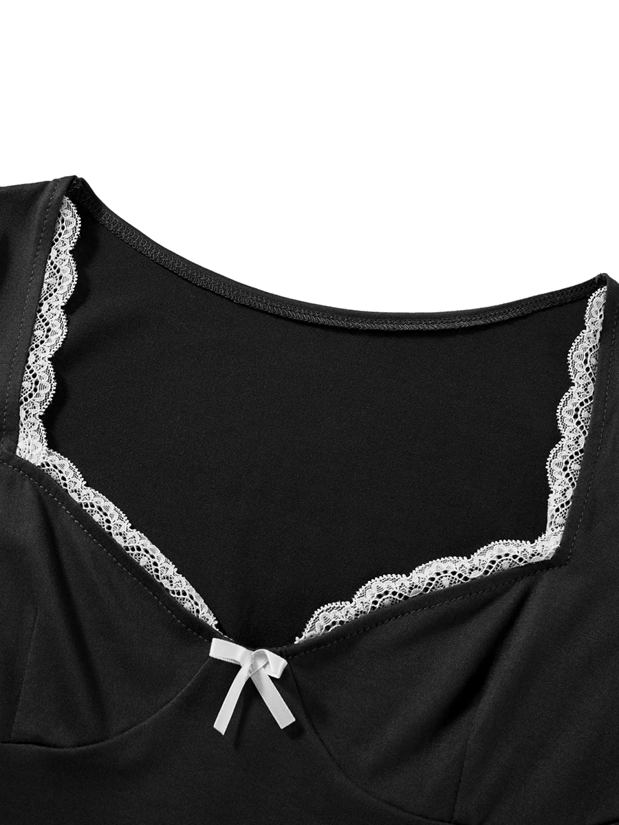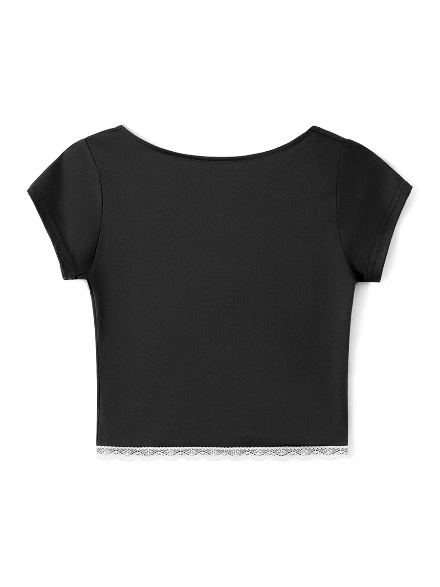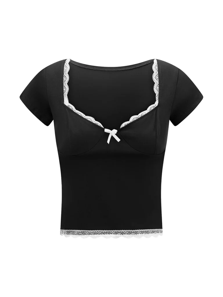 Women’s Lace Trim Cropped Tops Short Sleeve Sweetheart Neck Mini Bow Front Sweet T-Shirt